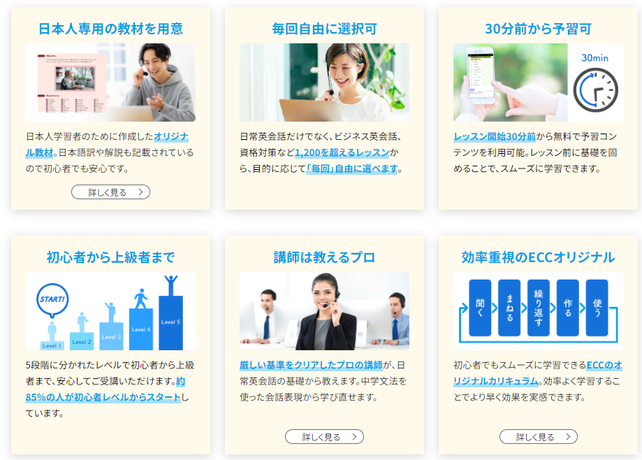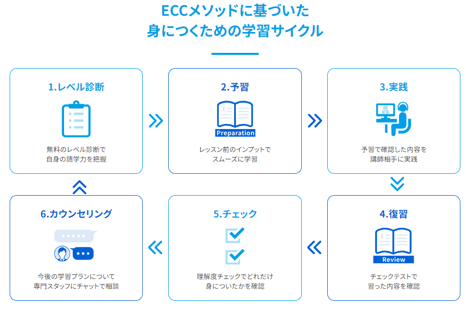 ECCメソッドに基づいた身につくための学習サイクルと日本人学習者のために開発されたオリジナル教材で勉強を進めていきます。最短・最速で英語力が身につく確かな方法で学ぶことができるので、英語学習に失敗したくない方に絶対おすすめです!